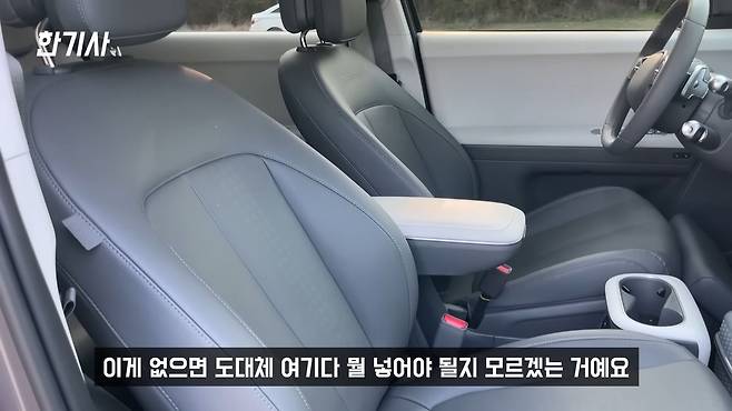 사실 운전석이랑 조수석 사이의 이 가운데 공간이 약간 쓸모없다는 느낌은 들어요. 왜냐면 여기 보시면 공간은 넓은데 뭘 넣을 수가 없어요. 그래서 제가 다이소에서 수납함을 사다가 넣어놨거든요. 이게 없으면 도대체 여기다 뭘 넣어야 될지를 모르겠는 거예요. 그리고 이것도 여기다가 뭘 놓고 쓰려면 덮개를 올려야 돼요. 이래야 되는 게 약간 귀찮긴 합니다.