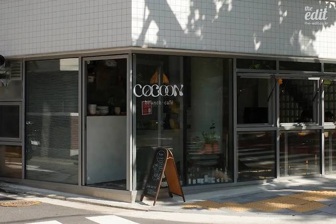 임정로는 효창공원을 삥 둘러싼 도로다. 공원의 나무를 눈에 담으며 걷기 좋은 완만한 경사로를 따라 오래된 빌라와 신축 오피스 빌딩이 줄지어 서 있다. 브런치 카페 코쿤도 여기에 있다. 하얀색 타일과 푸르스름한 유리블록의 격자무늬가 존재감을 드러내는 건물 1층에. 커피를 좋아하는 요리사와 브런치를 좋아하는 바리스타가 함께 꾸려가는 코쿤은 오전 9시에 문을 열고 오후 6시에 문을 닫는다. 브런치는 10시부터 3시까지. 브런치 타임에 한해 네이버 예약을 받지만 나는 예약 없이 9시 반까지 매장에 도착하는 일정을 추천한다.