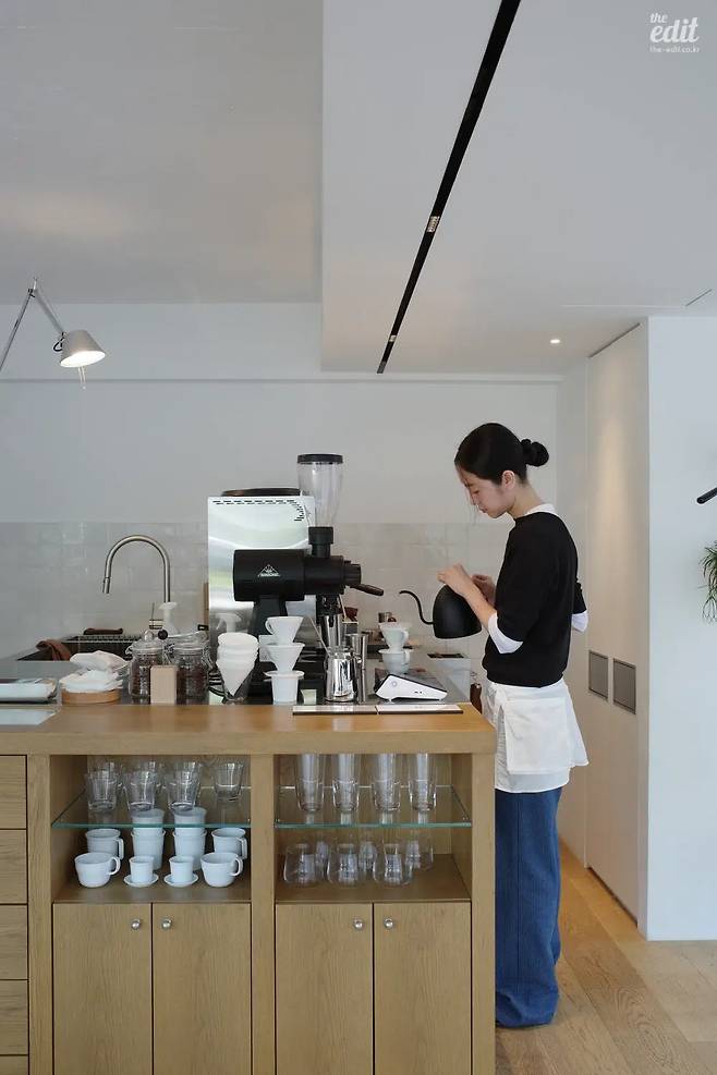 밝은 톤의 목재와 어우러지는 화이트 ・ 블랙 ・ 실버 컬러의 가구와 집기들. 중앙 키친에서 커피를 내리는 주인장의 모습까지 더해져 매장 전반에 차분하고 정갈한 기운이 감돈다. 통창을 따라 배치한 검정 가죽 의자는 푹신한 데다 책상과의 높이 차이도 적절해 장시간 책을 읽거나 노트북 작업을 하기에도 편하다. 흥미로운 포인트는 입장할 때와 앉아 있을 때의 시선이 달라진다는 것. 문을 열고 들어설 땐 키친에서 음료와 샌드위치를 만드는 사장님의 퍼포먼스가, 각 좌석에서는 창밖 골목의 풍경이 주인공이 된다.