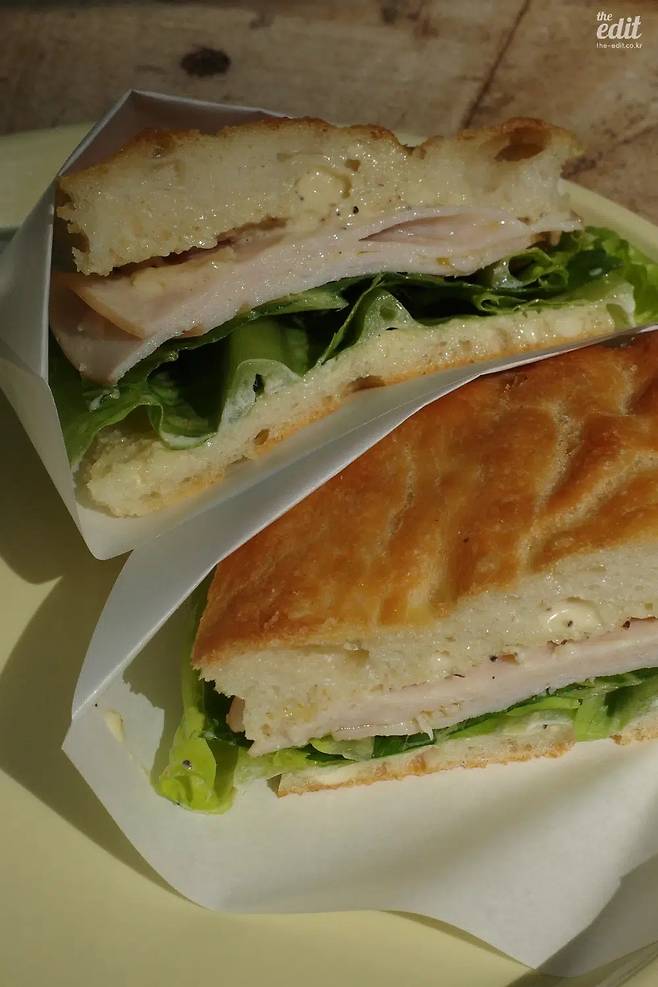 담백하면서도 감칠맛 넘치는 포카챠 샌드위치와 깔끔한 오늘의 커피는 더할 나위 없는 조합. 내가 먹은 치킨 시저 포카챠 샌드위치는 시저 드레싱을 바른 치킨 슬라이스 햄에 아삭한 로메인을 넣고 올리브오일과 후추, 그라노파다노 치즈까지 곁들여 짭조름한 풍미가 일품이었다. 출시하자마자 뜨거운 반응을 얻어 앞으로도 쭉 이어질 메뉴라고. 이 외에도 참외나 무화과처럼 제철 재료를 활용한 시즈널 샌드위치도 꾸준히 선보이는 중이다. 3,000원에 판매하는 오늘의 커피는 배치 브루로 제공한다. 주문 즉시 원두를 갈아 물을 부어주는 일반적인 브루잉 커피에 비해 향미가 약할지는 모르나, 이렇게 저렴한 가격에 산뜻한 스페셜티 커피를 맛볼 수 있다는 점에서 매일 공원을 찾는 이들의 데일리 커피로 손색이 없다.