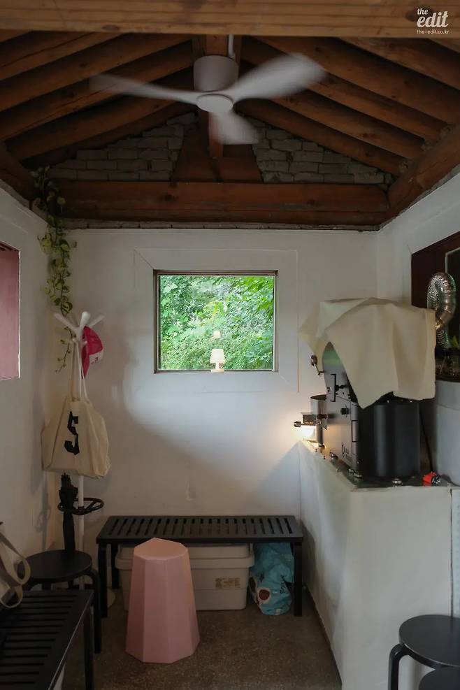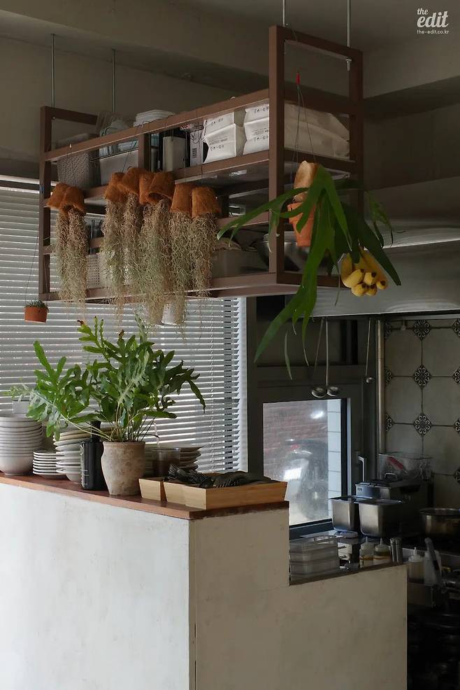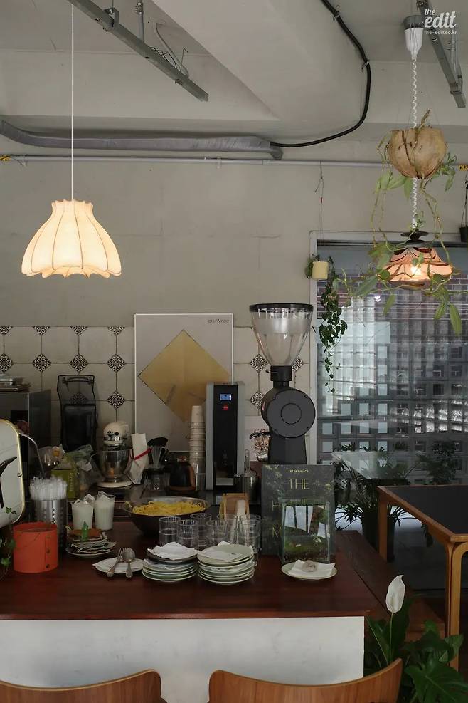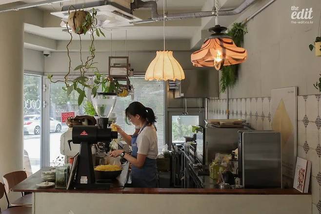 먼저 드립 커피를 주문하고 내부를 둘러봤다. 세월의 흔적이 느껴지는 고재 바닥과 톤이 비슷한 나무 가구, 여기저기 걸려 있는 식물들. 창을 통해 쏟아지는 자연광이 더해지니 효창공원의 짙은 녹음 풍경과 연결되는 하나의 시퀀스가 완성된다. 여기에 이국적인 분위기를 더하는 건 주방 벽면의 스페인 포세린 타일과 각기 다른 형태의 빈티지 펜던트 조명 같은 디테일이다. 밝고 쾌적한 공간을 선호하는 분들도, 소위 힙한 인테리어를 좋아하는 분들도 두루 만족할 테다.