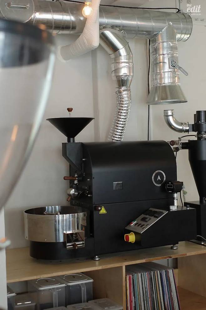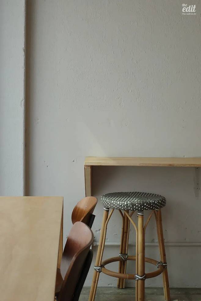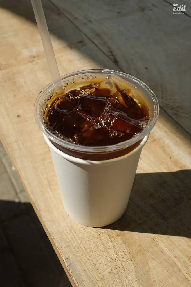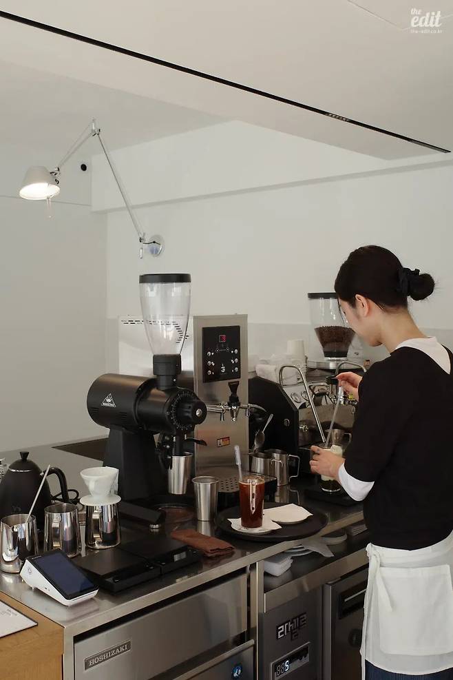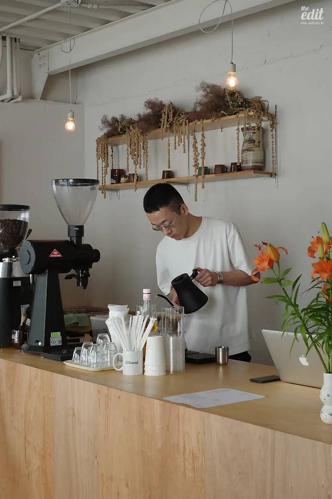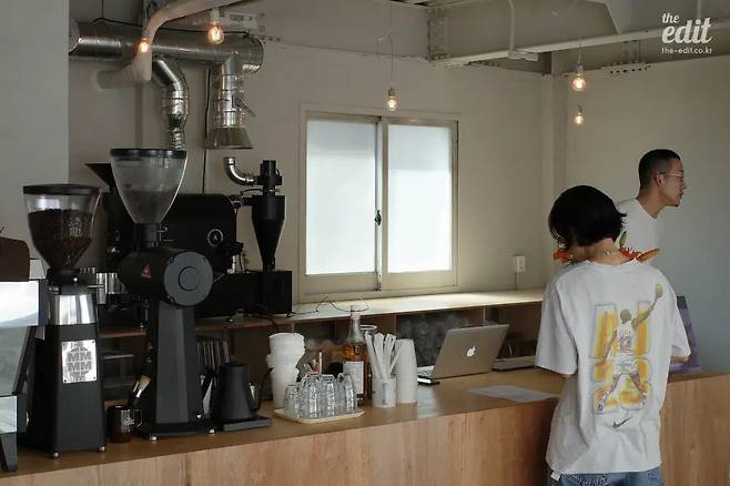 입구에서 반겨주는 귀여운 그림의 입간판. 매장 내부는 심플한 편이다. 길게 늘어선 우드 커피바와 육중한 부피의 검은색 로스터기가 보이고, 양쪽 벽면과 창가에는 셰어 테이블과 바 테이블을 배치한 채 중앙 공간은 텅 비워뒀다. 구석구석 주인장의 취향을 드러내는 물건들은 있지만 그 존재감이 압도적이지는 않다. 꽃이나 액자, 세라믹 컵, 주기적으로 바뀌는 레코드. 덕분에 시선은 커피에 집중된다. 그라인더가 돌아가는 소리와 천천히 푸어링(pouring)하는 손의 움직임, 선반 위의 원두 패키지 같은 것들에.