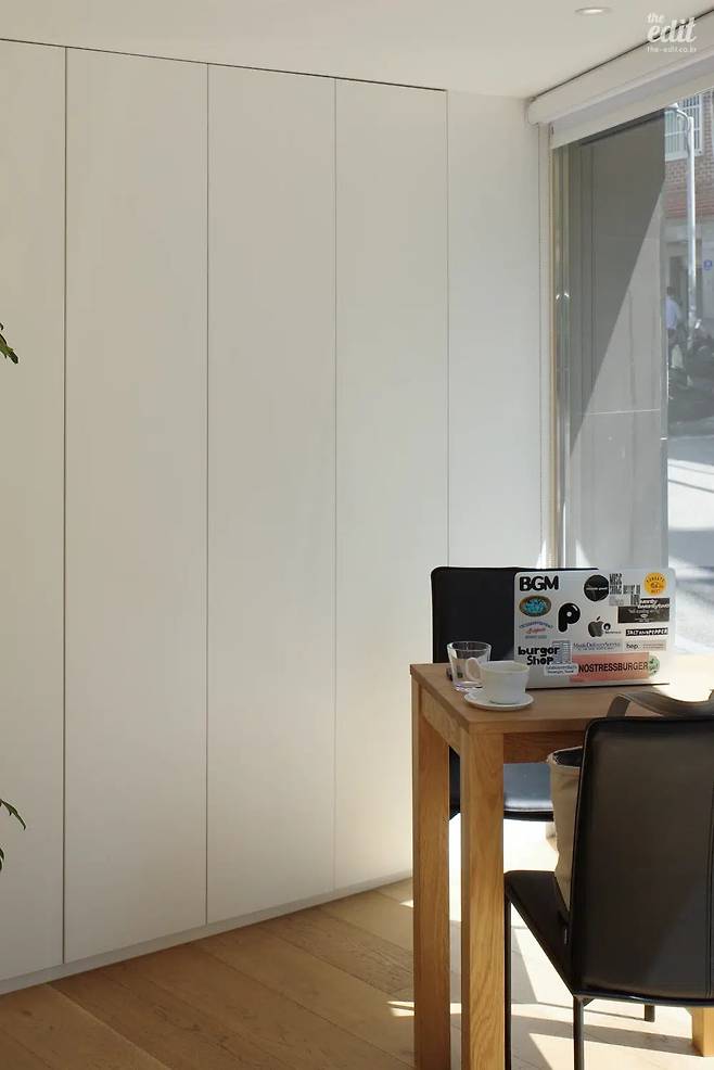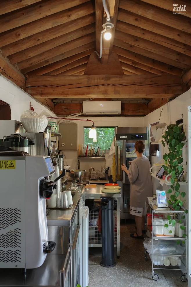 밝은 톤의 목재와 어우러지는 화이트 ・ 블랙 ・ 실버 컬러의 가구와 집기들. 중앙 키친에서 커피를 내리는 주인장의 모습까지 더해져 매장 전반에 차분하고 정갈한 기운이 감돈다. 통창을 따라 배치한 검정 가죽 의자는 푹신한 데다 책상과의 높이 차이도 적절해 장시간 책을 읽거나 노트북 작업을 하기에도 편하다. 흥미로운 포인트는 입장할 때와 앉아 있을 때의 시선이 달라진다는 것. 문을 열고 들어설 땐 키친에서 음료와 샌드위치를 만드는 사장님의 퍼포먼스가, 각 좌석에서는 창밖 골목의 풍경이 주인공이 된다.