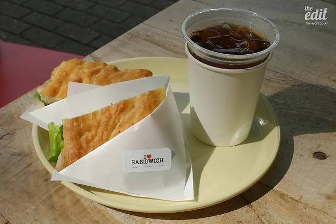 담백하면서도 감칠맛 넘치는 포카챠 샌드위치와 깔끔한 오늘의 커피는 더할 나위 없는 조합. 내가 먹은 치킨 시저 포카챠 샌드위치는 시저 드레싱을 바른 치킨 슬라이스 햄에 아삭한 로메인을 넣고 올리브오일과 후추, 그라노파다노 치즈까지 곁들여 짭조름한 풍미가 일품이었다. 출시하자마자 뜨거운 반응을 얻어 앞으로도 쭉 이어질 메뉴라고. 이 외에도 참외나 무화과처럼 제철 재료를 활용한 시즈널 샌드위치도 꾸준히 선보이는 중이다. 3,000원에 판매하는 오늘의 커피는 배치 브루로 제공한다. 주문 즉시 원두를 갈아 물을 부어주는 일반적인 브루잉 커피에 비해 향미가 약할지는 모르나, 이렇게 저렴한 가격에 산뜻한 스페셜티 커피를 맛볼 수 있다는 점에서 매일 공원을 찾는 이들의 데일리 커피로 손색이 없다.