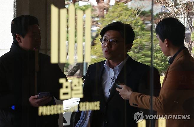 (서울=연합뉴스) 김도훈 기자 = 김병민 서울시 정무부시장이 13일 오세훈 서울시장에 대해 제기된 '명태균 여론조사 비용 대납 의혹' 관련 참고인 조사를 받기 위해 서울 서초구 서울중앙지검에 출석하고 있다. 2025.3.13