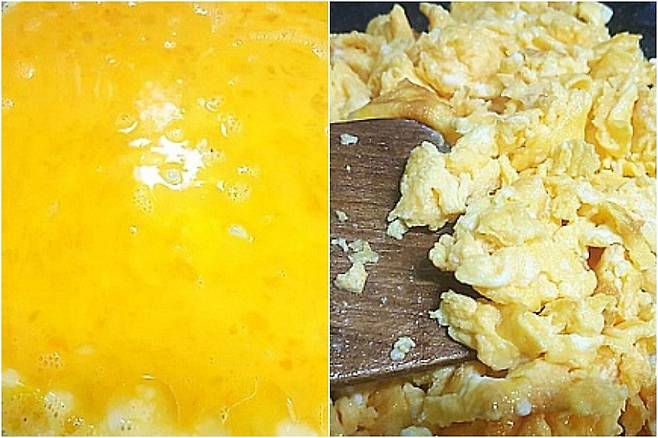 스크램블 에그를 만들어 줍니다. 잘 볶아진 달걀은 잠시 다른 접시에 담아 놓아요.