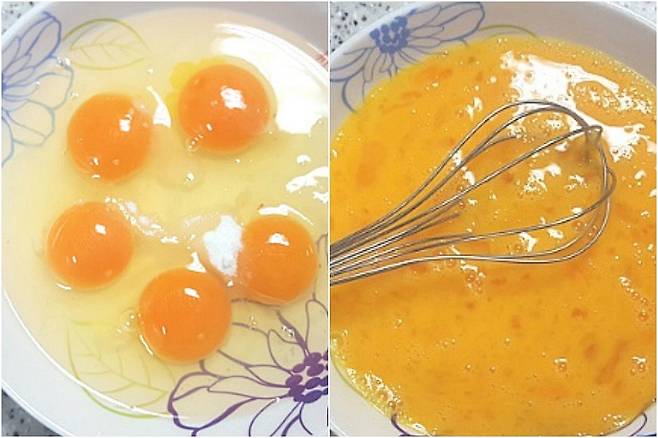 계란 5개를 풀어 소금 5꼬집과 설탕 약간 넣어준 뒤 잘 섞이도록 풀어줍니다. 설탕을 약간 넣어주면 계란의 비린맛을 잡아준다고 해요. 설탕 싫으시면 빼셔도 됩니다.