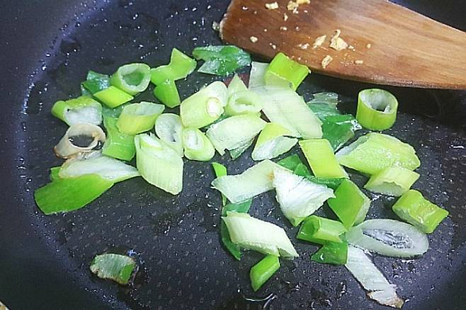달걀을 볶았던 팬에 썰어둔 대파를 넣어 주고 노릇노릇 볶아 파기름을 내줍니다