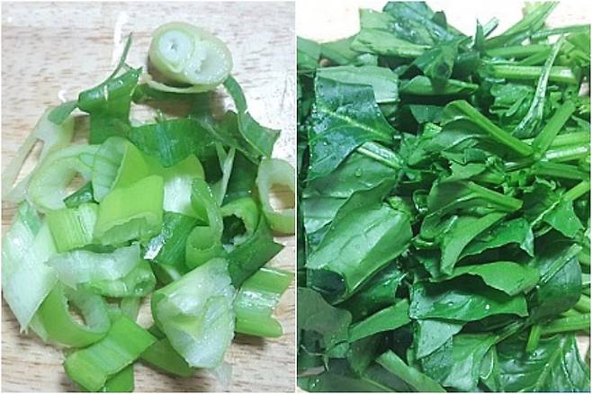 먼저 대파를 쫑쫑쫑 썰어주시고요. 시금치는 꼭지를 다듬어 여러 번 물에 깨끗이 씻어준 뒤 5등분 정도로 나눠 썰어줍니다.