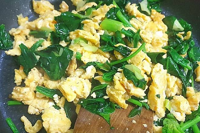 부드러운 스크램블 에그와 파기름에 볶아진 시금치의 조화가 정말 잘 어울리고 맛있어요. 그냥 반찬으로 드셔도 맛있고 고추장 약간 넣고 비빔밥 해 드셔도 맛있습니다. 시금치의 철분. 엽산이 계란 단백질과 결합해 혈액 생성과 빈혈 예방에 효과적인 '시금치 달걀볶음' 한번 만들어 보세요!