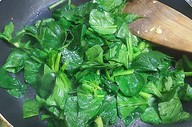 그다음 손질해 둔 시금치에 후추와 소금 약간 넣고 숨이 죽도록만 살살 볶아 줍니다.