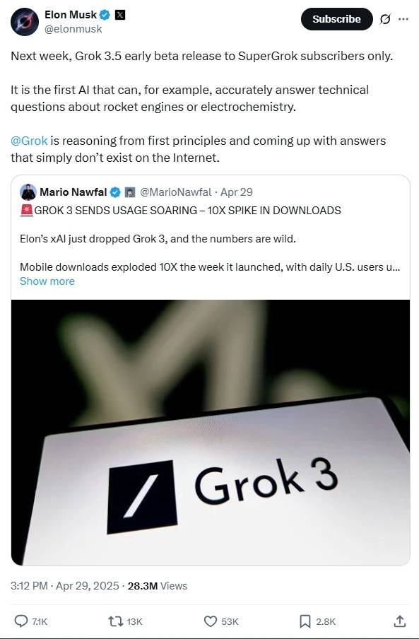 일론 머스크가 자사의 AI모델 ‘그록(Grok)’의 최신 버전 출시를 예고했다. 29일(현지시간) 일론 머스크는 X(구 트위터)를 통해 다음 주 중 '그록 3.5'의 베타 버전을 공개할 것이라 밝혔다. 이 베타 버전은 슈퍼그록(SuperGrok) 구독자에게 먼저 공개될 예정이며 무료 사용자들을 대상으로 한 출시 일정은 아직 확정되지 않았다.