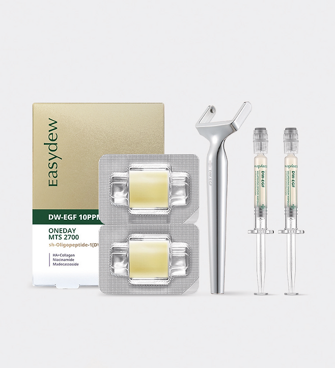 EGF 성분이 함유된 대표적인 제품으로는 ‘DW-EGF 기미토닝’이 있다. ‘DW-EGF 멜라토닝 앰플’과 ‘DW-EGF 원데이 MTS2700’으로 구성된 이 제품은 99% 고순도·고활성 피부재생 인자인 DW-EGF 성분이 함유돼 있고, 깊고 진한 기미 잡티를 완화하는 데 도움을 준다. 피부에 녹아드는 히알루론산과 EGF 등 앰플에 있는 화장품 성분을 2700개의 샷으로 만든 MTS2700은 유효 성분을 피부에 직접 침투시키고 100% 녹아들 수 있게 해 기미, 잡티, 색소침착 부위의 토닝 효과를 더욱 강화하는 역할을 한다. 미세한 상처가 있는 피부에서 EGF가 잘 발현되기 때문에 두 제품을 함께 사용하는 것이 효과적이다.
