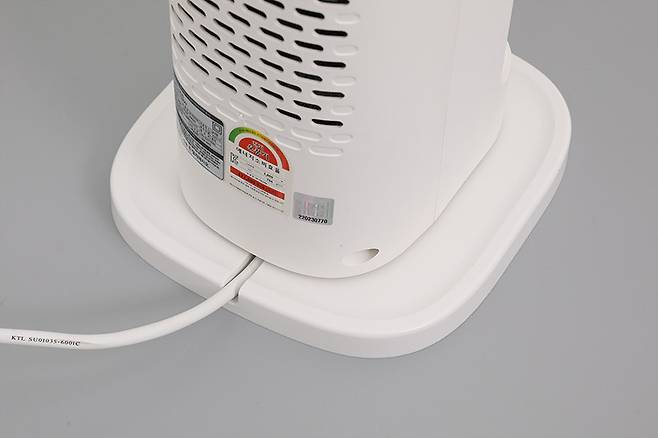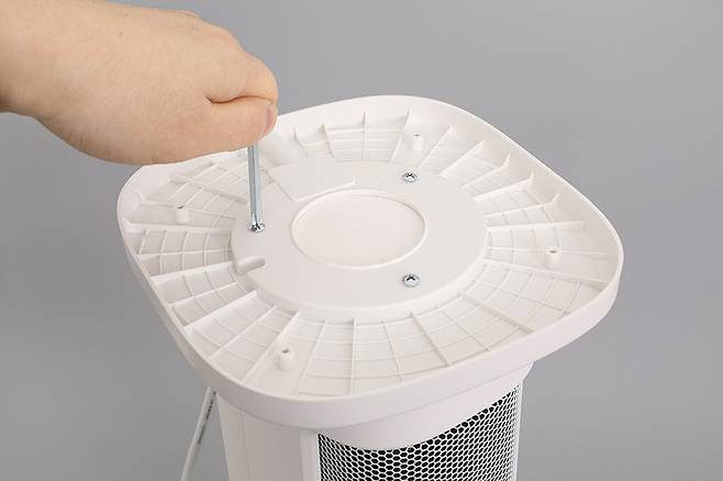 받침대 조립이 완료된 모습은 다음과 같다. 세로로 긴 형태의 타워형이기 때문에 좁은 공간에서도 불편 없이 사용할 수 있다는 점이 매력적이다. 본체 전면부는 거의 대부분의 영역이 안전망으로 씌워져 있다.