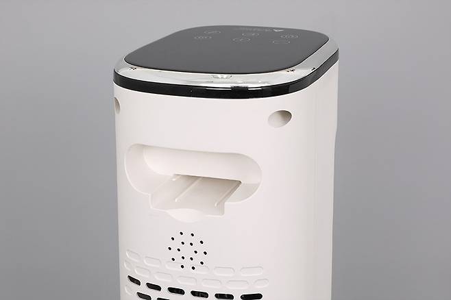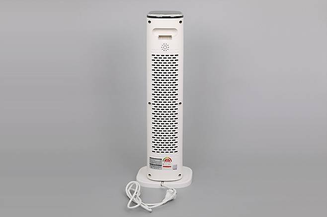 한경희 초저소음 PTC 타워형 리모컨 온풍기 전기히터 GF-FN2500의 뒷면을 보면 앞면 대부분이 안전망으로 되어있던 것처럼 뒷면 대부분은 공기 흡입구로 되어있다. 다만 공기 흡입구는 별도의 소재를 사용한 것이 아니라 뒷면에 직접 타공이 된 형태이다.