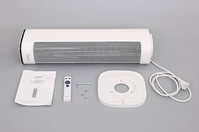 한경희 초저소음 PTC 타워형 리모컨 온풍기 전기히터 GF-FN2500은 갈색 골판지 박스에 스티로폼 완충재로 단단히 보호되어 담겨있다. 박스 안에는 온풍기 본체와 받침대, 세 개의 나사와 공구, 리모컨, 그리고 사용 설명서가 들어있다.