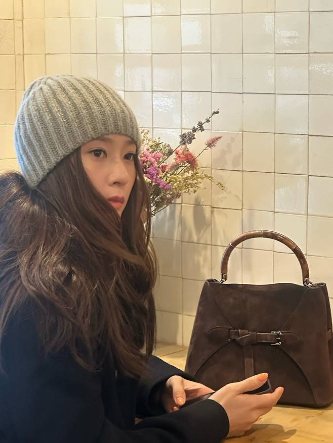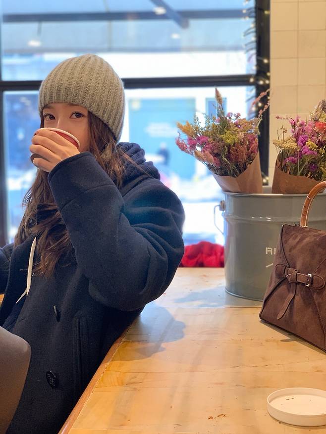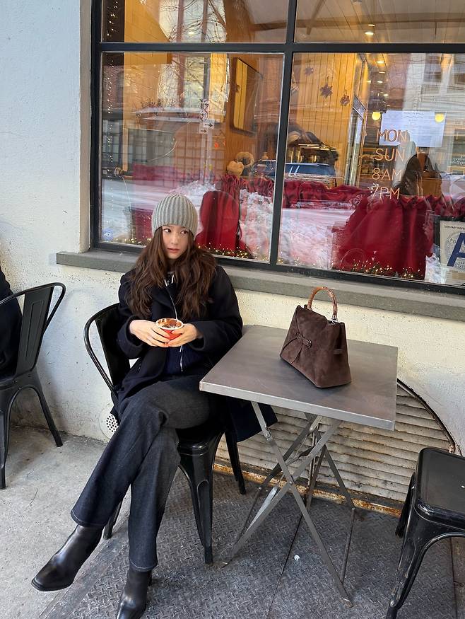 정수정은 차분한 블랙 피코트와 그레이 니트 비니를 조합해 시크한 매력이 돋보이는 겨울 룩을 연출했습니다.