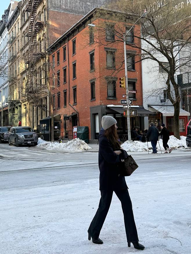 굵은 짜임의 비니가 이목구비를 더욱 강조하며 편안하면서도 스타일리시한 무드를 완성했습니다.