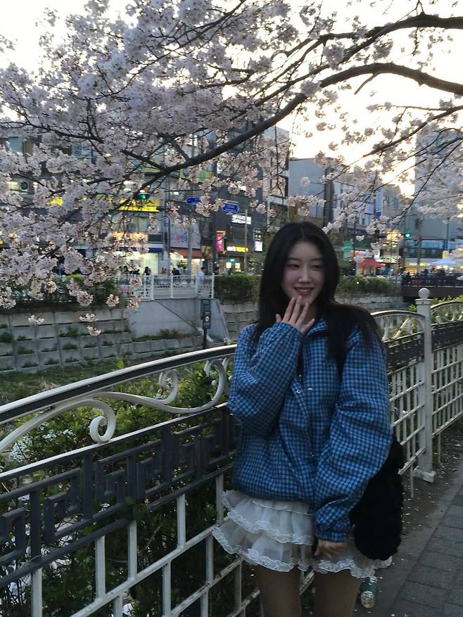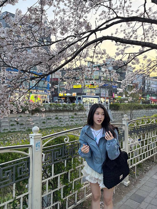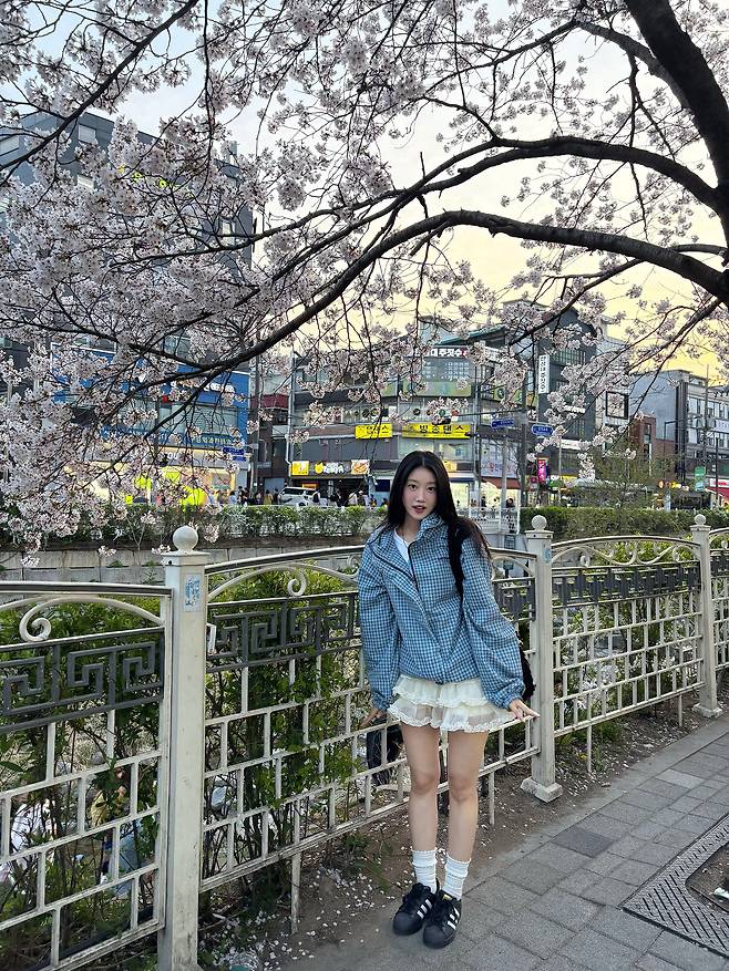 스포티한 아우터와 러블리한 스커트의 조합은