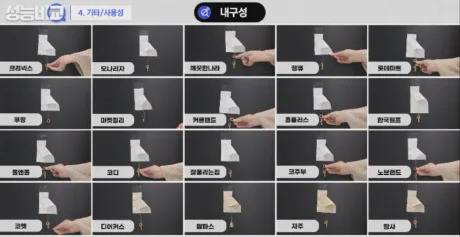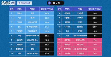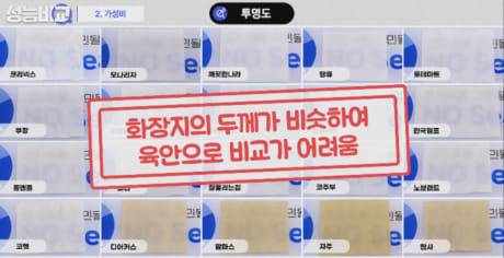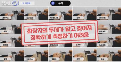 크리넥스, 홈플러스, 깨끗한나라, 노브랜드 화장지는 17g 이하의 가장 적은 무게에도 찢어지기 시작했으며, 팜파스, 자주, 코주부, 탐사, 한국펄프는 25g 이상까지도 찢어지지 않았는데, 팜파스는 약 58g까지 버틸 수 있을 정도로 가장 내구성이 좋아 두꺼운 화장지로 생각됐습니다.