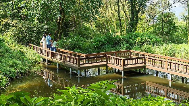 현장 벌채목을 재활용해 만든 목도를 따라 걸으면 습지 생태계가 눈앞에 펼쳐지고, 145m 길이의 수로는 자연 수자원의 활용과 보존을 동시에 보여주는 살아 있는 교재가 된다.