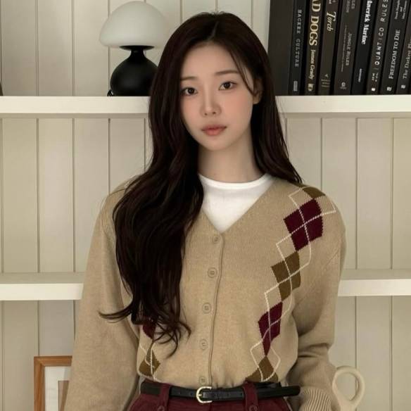 아가일 패턴의 카디건에 와인 빛의 코듀로이 쇼츠를 매치하고 얇은 블랙 벨트로 포인트를 준 스타일링을 한 이시안. 외투로는 오버핏의 그레이 컬러 더블 버튼 롱코트를 매치해 짧은 기장감의쇼츠와 대비되는 긴 실루엣을 연출했네요.
