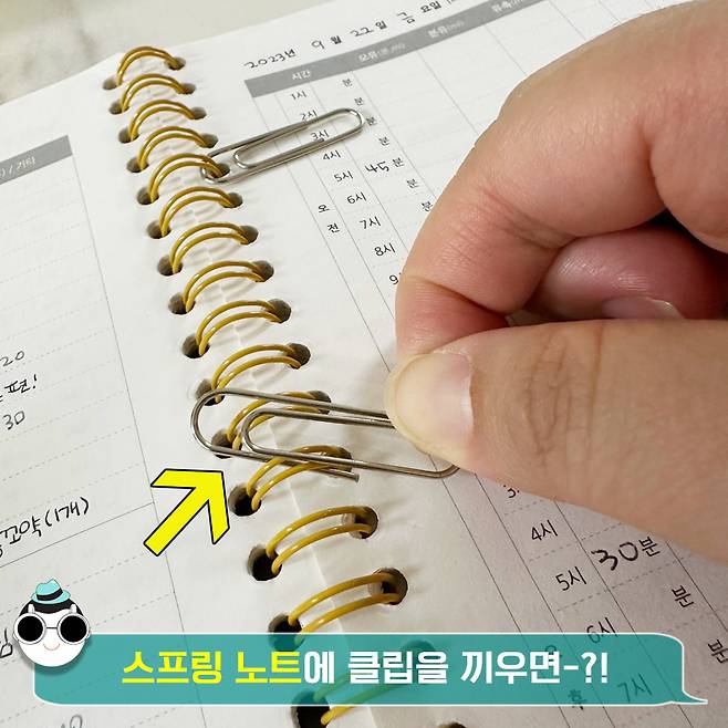 클립을 스프링노트 속 스프링 상단과 하단에 끼워보세요. 낄 때는 뾰족한 부분을 스프링 사이로 넣어준 후 다시 한번 한바퀴 돌려줄게요.