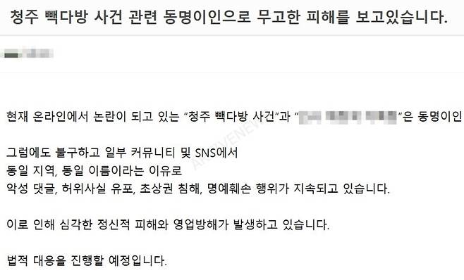 해당 인물은 지난 30일 "청주 빽다방 사건 관련 동명이인으로 무고한 피해를 보고 있다"라는 글을 작성해 "저는 그 사건과 전혀 관련이 없다. 동일 지역, 동일 이름이라는 이유로 악성 댓글, 허위사실 유포, 초상권 침해, 명예훼손 행위가 지속되고 있다"라고 피해를 호소했습니다.