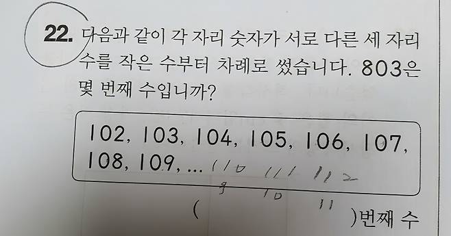 다음과 같이 각 자리 숫자가 서로 다른 세 자리 수를 작은 수부터 차례로 썼습니다. 803은