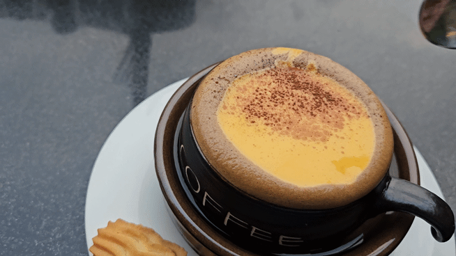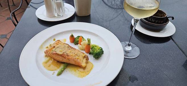 호수에 분위기 좋은 카페가 있길래 에그커피랑 연어스테이크 먹음.
