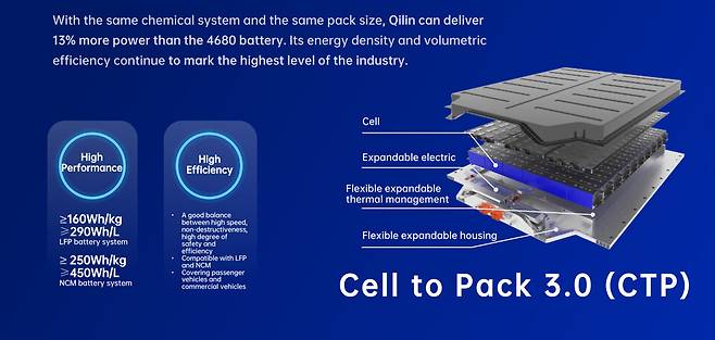 CATL은 지난해 6월 기린배터리3.0을 최초로 공개, 당시 CATL은 4680팩 구조를 활용해 배터리의 안전성, 수명, 고속충전 성능 및 에너지 밀도를 더욱 향상시켰다고 발표했다. 기린배터리3.0은 3세대 셀투팩 기술을 적용해 부피 이용률은 72%이상, 에너지 밀도는 225Wh/㎏에 달한다.