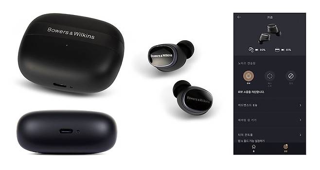 B&W 전용 앱인 Music | Bowers & Wilkins을 지원한다. 간단한 회원 가입 및 메일 인증 절차가 필요하지만, 전용 기능들과 EQ 설정 등을 맞추려면 당연히 필수적으로 설치해야 한다. 앱에서는 노이즈 캔슬링, 패스 스루, 끄기를 시각적으로 선택할 수 있고, 5밴드를 조절할 수 있는 어드밴스드 EQ를 제공하고, 완전히 중립적인 트루 사운드까지 세팅할 수 있다. 또한 이어 버드 하우징 터치 컨트롤의 탭 및 홀드 기능을 설정할 수 있고, 착용에 따라 일시 정지되는 기능을 켜고 끌 수 있다. 그 외에도 시스템 업데이트 및 공장 초기화, 스트리밍 링크 서비스, B&W 컬렉션인 팟캐스트를 플레이할 수도 있다.