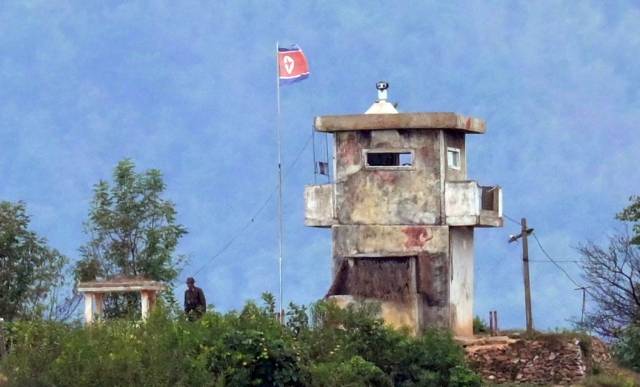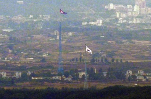 남북 군사적 긴장이 고조되는 14일 경기도 파주의 한 야산에서 바라본 북녘에 북한 기정동 마을의 인공기가 태극기와 함께 펄럭이고 있다.