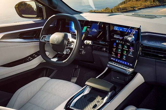 르노의 오픈R 디스플레이 시스템은 24인치 디지털 패널과 최대 9.3인치 헤드업 디스플레이로 구성되어 있으며, 구글 OS가 내장돼 지도, 앱, 음성 제어 등 다양한 스마트 기능을 누릴 수 있다.