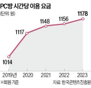10일 한국콘텐츠진흥원의 ‘2024 대한민국 게임백서’에 따르면 2023년 PC방 시간당 이용 요금은 회원 기준 1178원으로 2019년(1014원)보다 16.1% 올랐다. 같은 기간 비회원 이용 요금은 1188원에서 1355원으로 14% 상승했다.