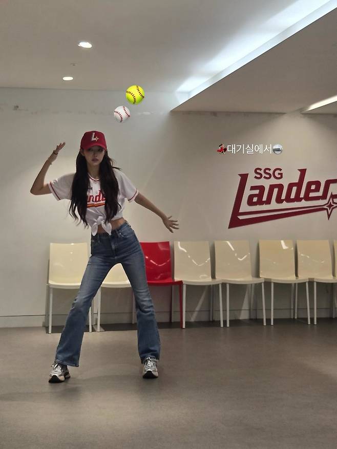 SSG 랜더스 로고 앞, 대기실 한켠에서 김혜진이 포즈를 취했다. 사진 속 그는 마치 경기 시작을 알리는 투수처럼 팔을 치켜들고, 눈빛엔 장난기와 긴장감이 동시에 스친다. ‘대기실에서’라는 짧은 멘트와 함께 야구공과 소프트볼 이모지가 공중에 떠 있는 연출이, 단순한 대기실 컷을 하나의 콘셉트 화보로 완성시킨다.