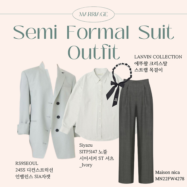 결혼식에 입기 적절한 옷차림이죠!절제된 핏에서 나오는 심플하고 간결한 느낌의세미정장은 오랫동안 사랑받고 있는 거 같아요.그만큼 가장 클래식하고 오리지널한 아웃핏!한번 사두면 오랫동안 두고두고 입을 수 있는게큰 장점인 것 같습니다.