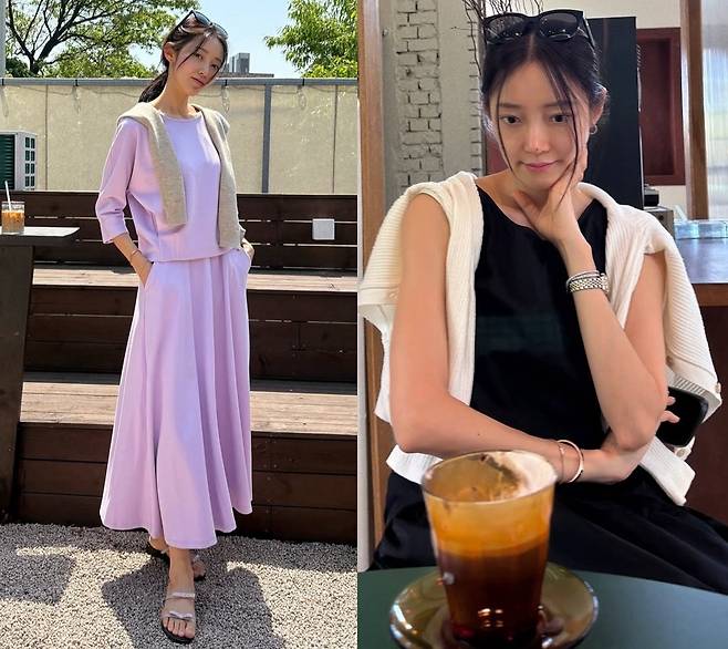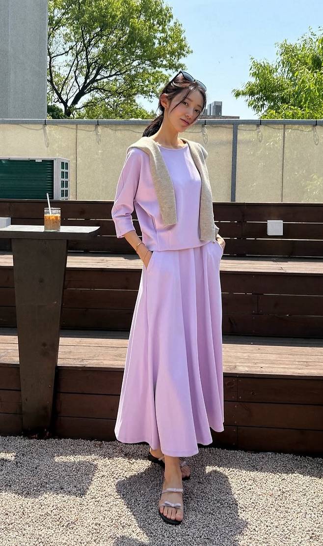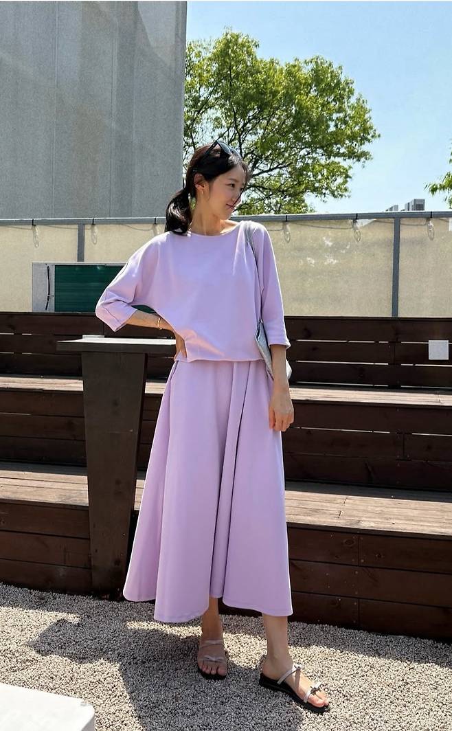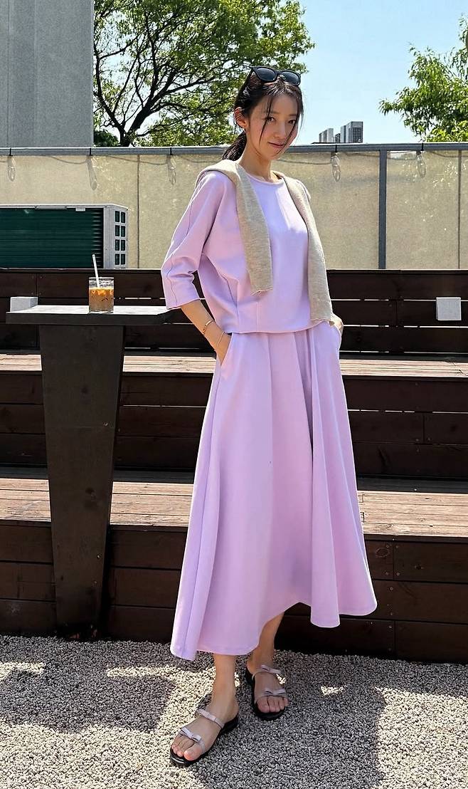 연보랏빛 투피스는 톤온톤 컬러감과 가볍게 걸친 니트 숄더 스타일링으로 산뜻하고 우아한 분위기를 연출했으며, 미니멀한 스트랩 샌들로 여름 감성을 더했습니다.