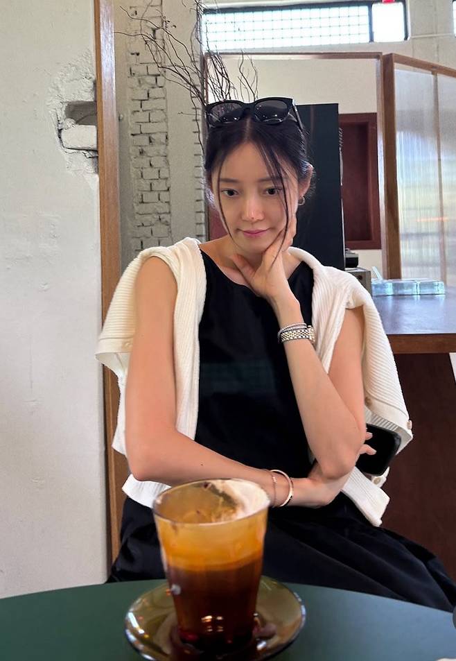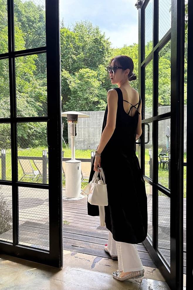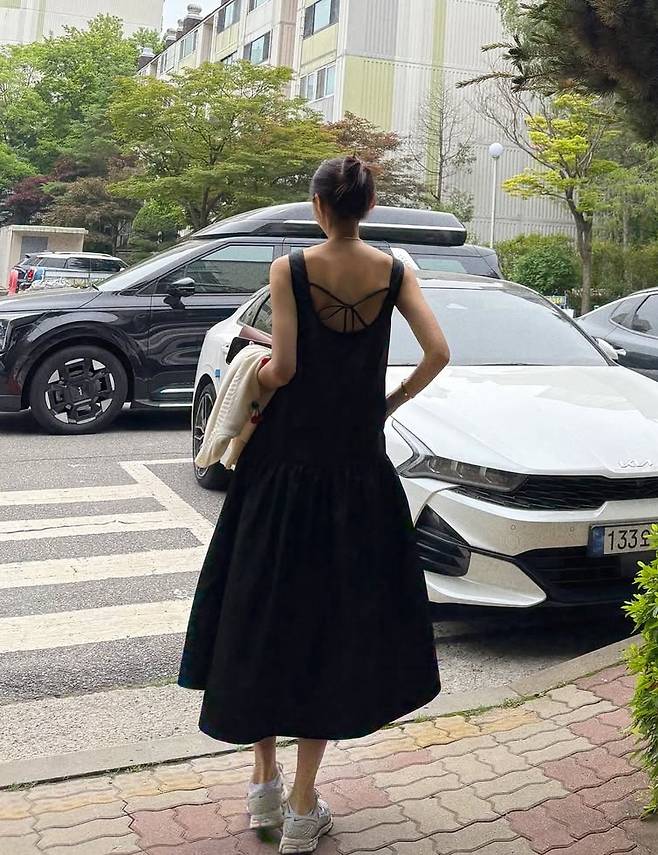 블랙 원피스 룩은 화이트 니트를 무심하게 걸쳐 내추럴한 꾸안꾸 감각을 살렸고, 실버 뱅글과 시계로 포인트를 더해 감도 높은 스타일을 완성했습니다.