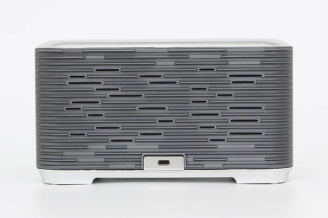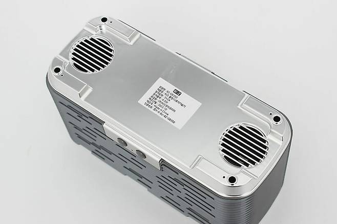 본체 뒷면에도 앞면과 동일하게 가로로 얇은 홈이 다수 나 있으며, 중앙 아래쪽에는 전원 포트가 위치해 있다.