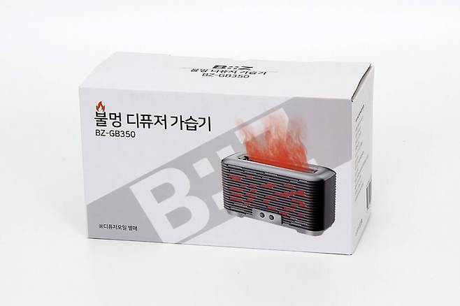 2IN1 비즈 불멍 디퓨저 가습기 BZ-GB350은 흰색 바탕 박스에 담겨있다. 박스 앞면에는 제품의 활용컷을 컬러 이미지로 인쇄해 전체적인 디자인을 미리 가늠할 수 있다.