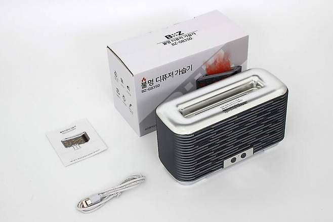 구성품으로는 2IN1 비즈 불멍 디퓨저 가습기 본체와 전원 케이블, 그리고 사용 설명서 등 상당히 심플하게 구성되어 있다.