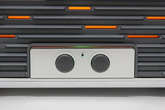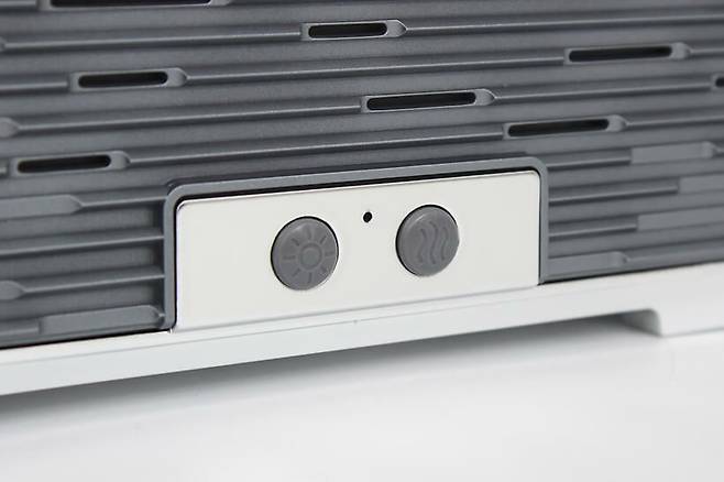 본체 중앙 아래쪽에는 두 개의 원형 버튼과 LED 인디케이터가 하나 있다. 왼쪽의 태양 로고가 있는 버튼은 조명 선택 버튼이며, 오른쪽의 연기 모양 로고가 있는 버튼은 타이머 버튼이다.