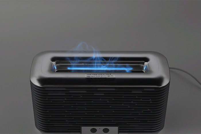 조명이 켜진 상태에서 오른쪽 버튼을 누르면 가습 기능이 동작하기 시작한다. 물안개처럼 피어오르는 습기에 LED의 빛이 더해지면서 마치 진짜 나무에 불을 붙여둔 것 같은 불꽃 효과가 나타난다. 조명 색상을 푸른색으로 바꿔도 색다른 불꽃 느낌으로 안전하게 불멍을 즐길 수 있다.