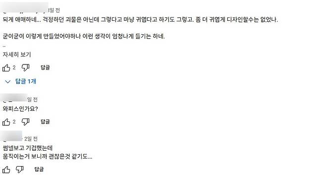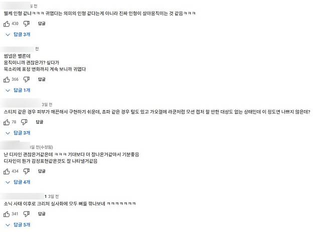 근데 내가 댓글들을 쭉 살펴보니까 부정적인 반응보다는 긍정적인 반응이 훨씬 많더라! 👍 “인형 같다. 진짜 인형이 살아 움직이는 것 같다”, “목소리에 표정 변화까지 계속 보니까 귀엽다”, “기대보다 더 잘 나온 것 같다”, “썸네일 보고 충격 먹고 들어왔는데 보다 보니 귀엽다. 잘 뽑혀서 좋다”, “생각했던 것보다 잘 나왔다. 목소리 연기도 찰떡이다” 등등 칭찬 일색이야! 🥰