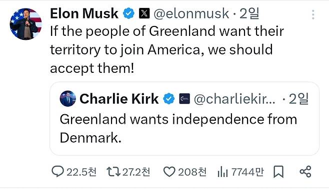그린란드 사람들이 미국에 병합되길 원한다면 우리는 그것을 승인할 것이라는 내용이었다.