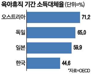 경제협력개발기구(OECD)에 따르면 한국의 육아휴직 기간 소득대체율은 44.6%로 집계됐다. 오스트리아(71.2%), 독일(65%) 등 유럽이나 일본(59.9%)보다도 낮은 수치다.