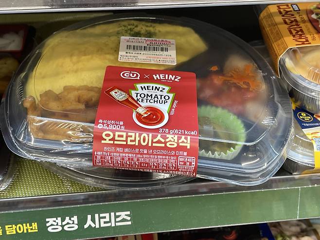 CU 하인즈 오므라이스정식은 CU와 하인즈 소스 브랜드가 협업해 선보인 간편식 도시락으로, 케첩으로 볶아낸 밥 위에 계란 지단과 미트볼이 올라간 메뉴예요.