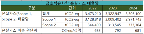 18일 금호석화의 지속가능경영보고서에 따르면 법인의 직·간접 총 온실가스 배출량(Scope 1+Scope 2)은 330만5100tCO2eq(이산화탄소 환산톤)로 전년 대비 0.5% 감소했다. 전년과 비슷한 수치지만 목표치 346만tCO2eq 대비 95% 수준으로 배출해 목표를 달성했다.