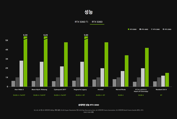 엔비디아 공식 홈페이지에 공개된 RTX 5060 관련 자료에 따르면 DLSS4 와 MFG 적용 시 기존 RTX 3060의 최대 6.3배, RTX 4060의 최대 2배 가량의 게임 성능을 가진다. 가격은 미화 $299로 공개됐다.